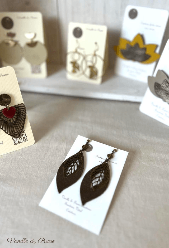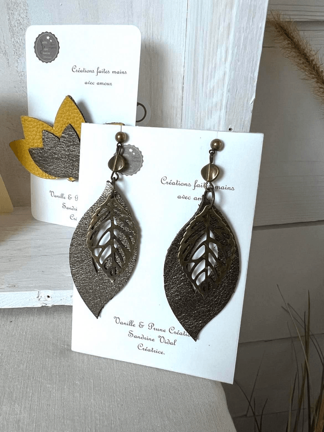 Pour marquer la nouveauté de cette collection de boucles d'oreilles en chutes de cuir recyclé, vous trouverez deux formes de feuilles mi-longues évidées en cuir véritable de couleur bronze irisé. Assortie une breloque en forme de feuille ajourée plus petite bronze.